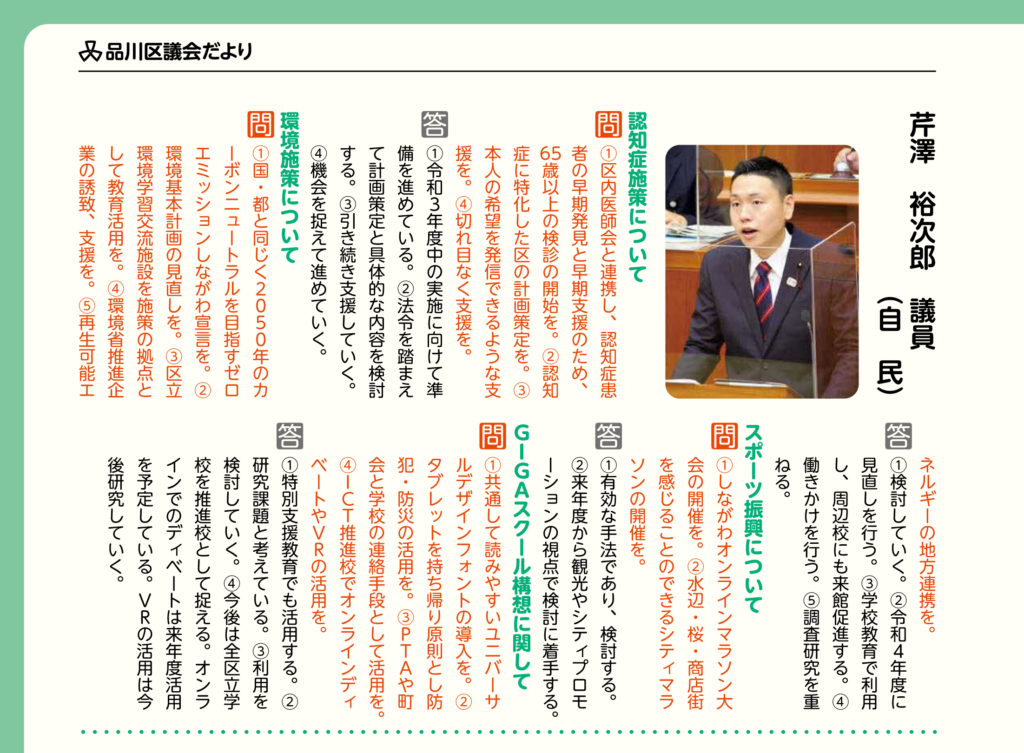令和2年11月27日 品川区議会 令和2年第四回定例会にて、品川区議会自民党を代表して一般質問を行いました。 以下、質疑応答のまとめです。 ハイライトは画像でご...